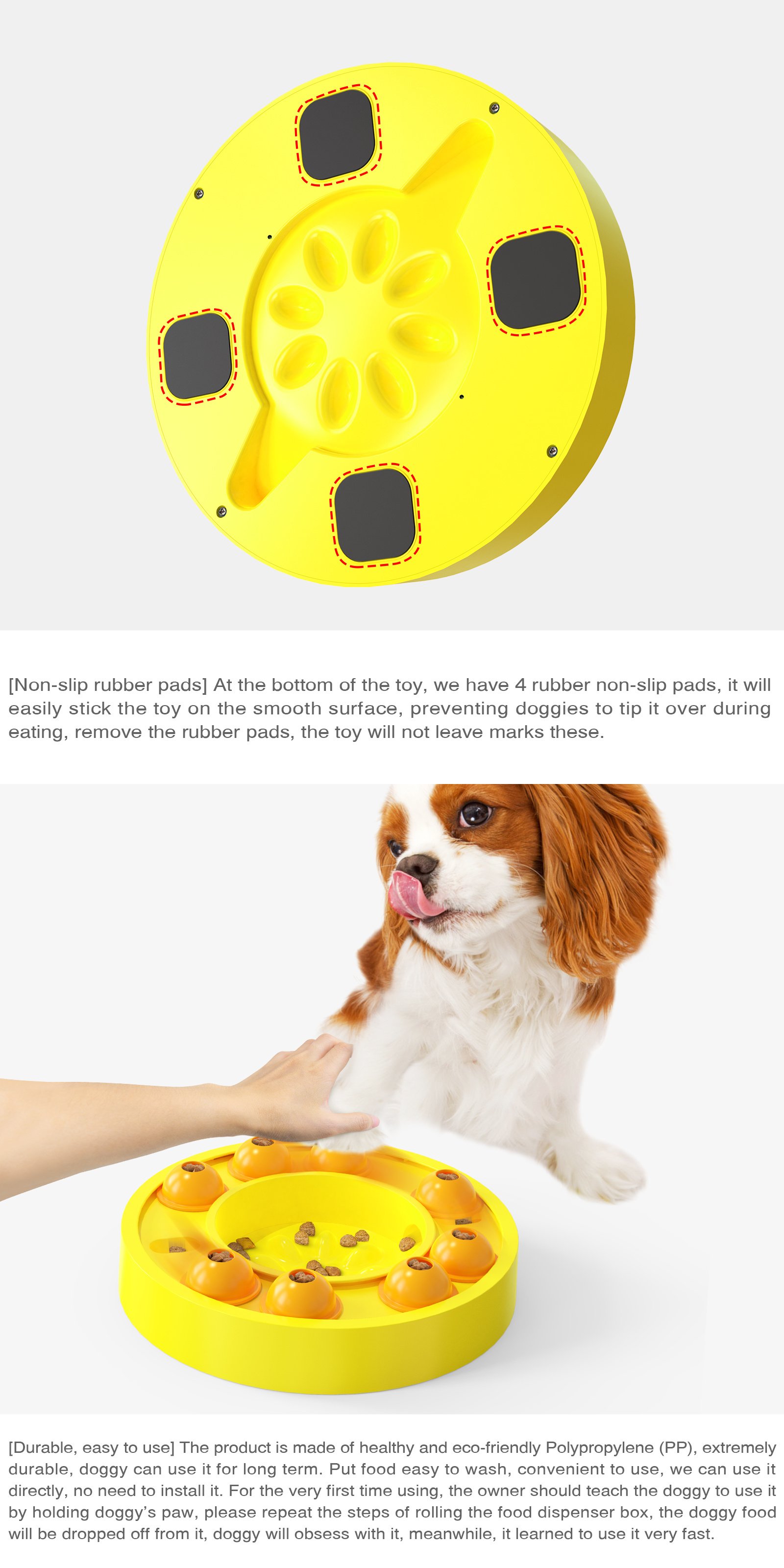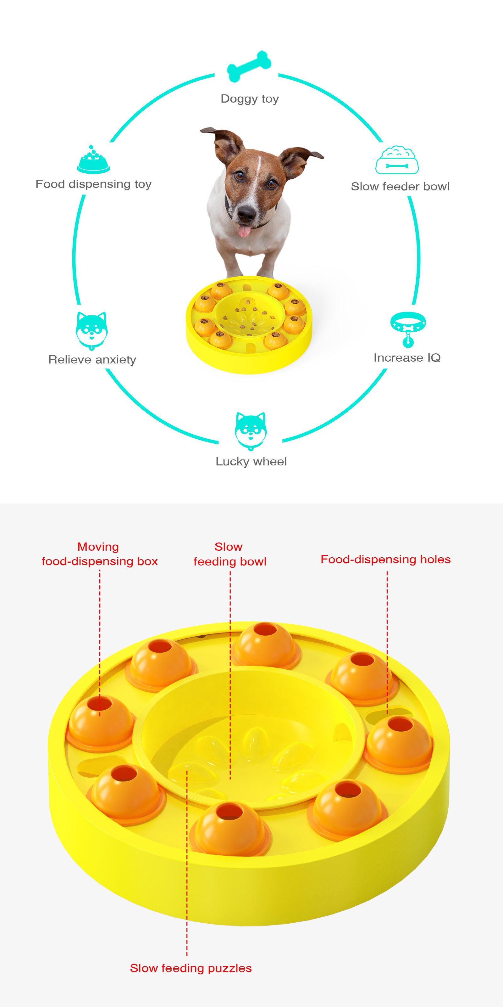 2.The top of thr toy is designed with a leaky turntable. There are several rotatable leaky boxes on the track of the turntable. the hole on the top of the leaky boxes can be put into dog food or snacks. the dog's interest in play an also improve the dog'sintelligence.