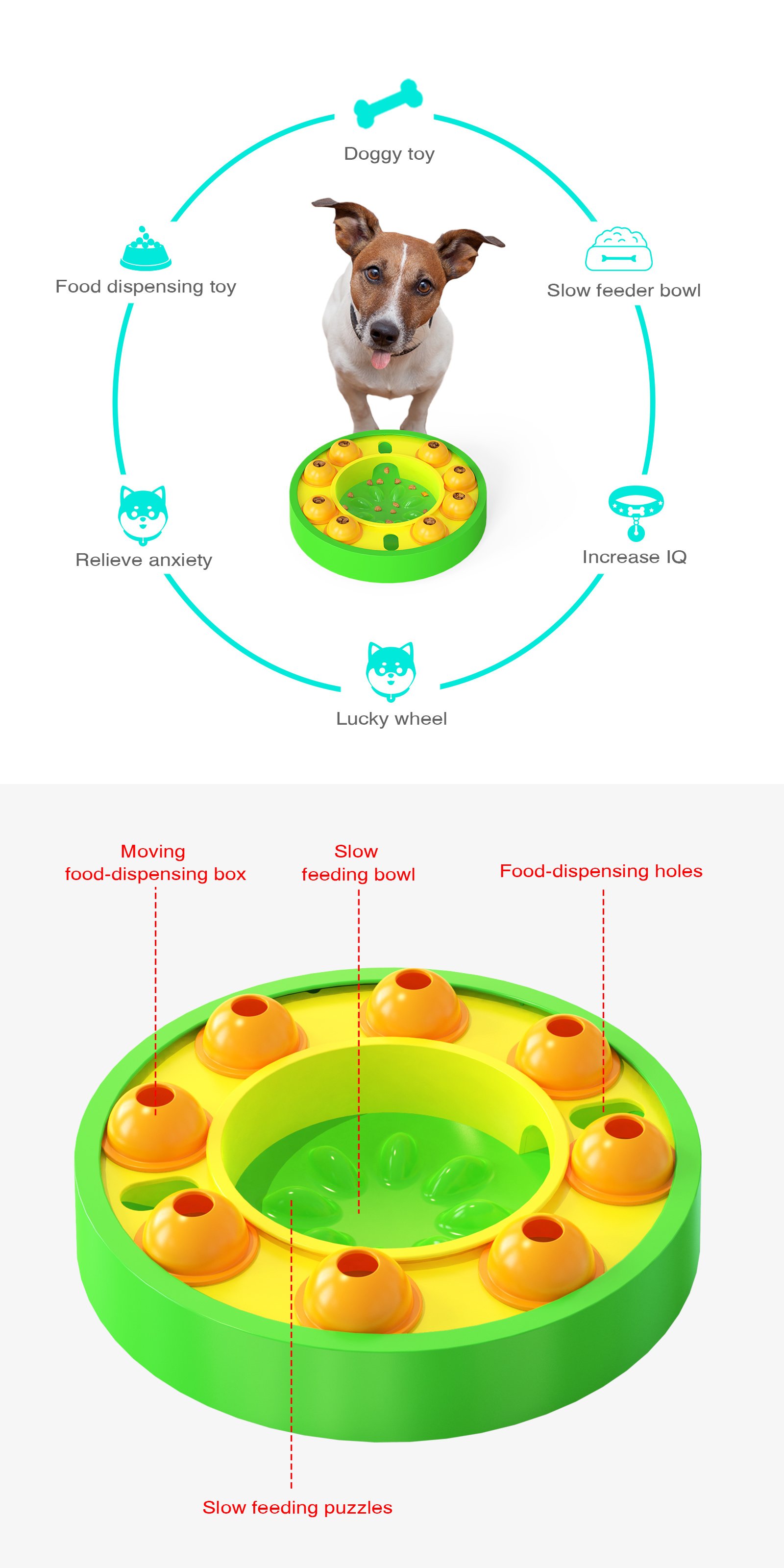 2.The top of thr toy is designed with a leaky turntable. There are several rotatable leaky boxes on the track of the turntable. the hole on the top of the leaky boxes can be put into dog food or snacks. the dog's interest in play an also improve the dog'sintelligence.