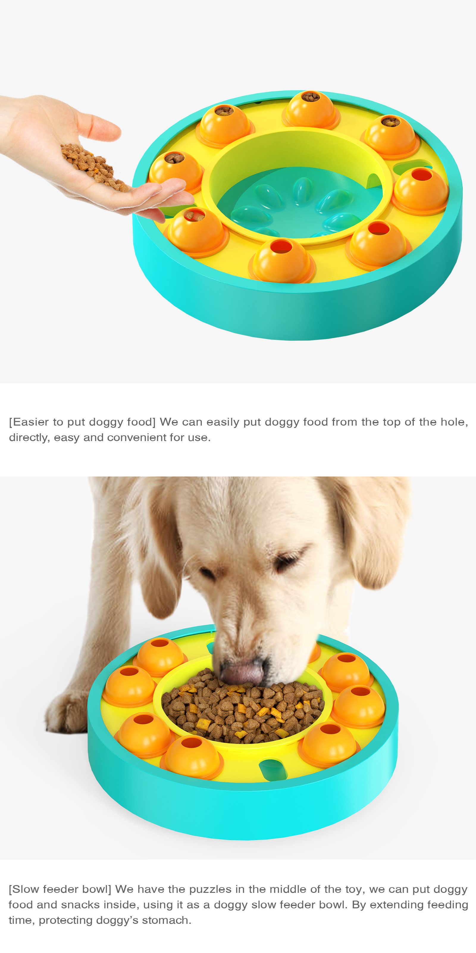 2.The top of thr toy is designed with a leaky turntable. There are several rotatable leaky boxes on the track of the turntable. the hole on the top of the leaky boxes can be put into dog food or snacks. the dog's interest in play an also improve the dog'sintelligence.