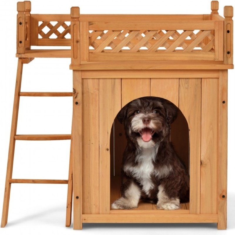2.2-Tier Design Guarantees Enough Activity Space: 2-story wooden pet dog house, including an indoor lounge area, climbable stairs, and a rooftop balcony with a railing, allows your dog to play, relax, sunbathe, sleep and fully enjoy their outdoor activities. The enough space of this dog house will off