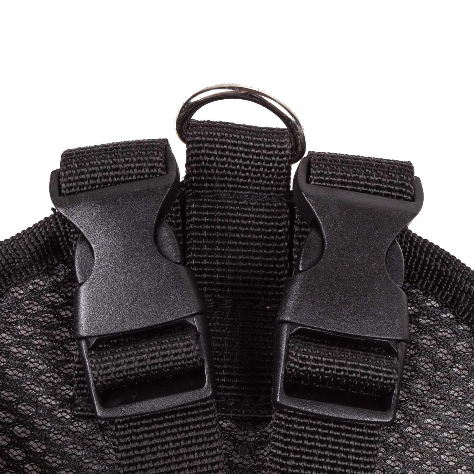 2.Features an Above Stainless Steel Harness Ring with Dual Adjustable Straps along the back-side