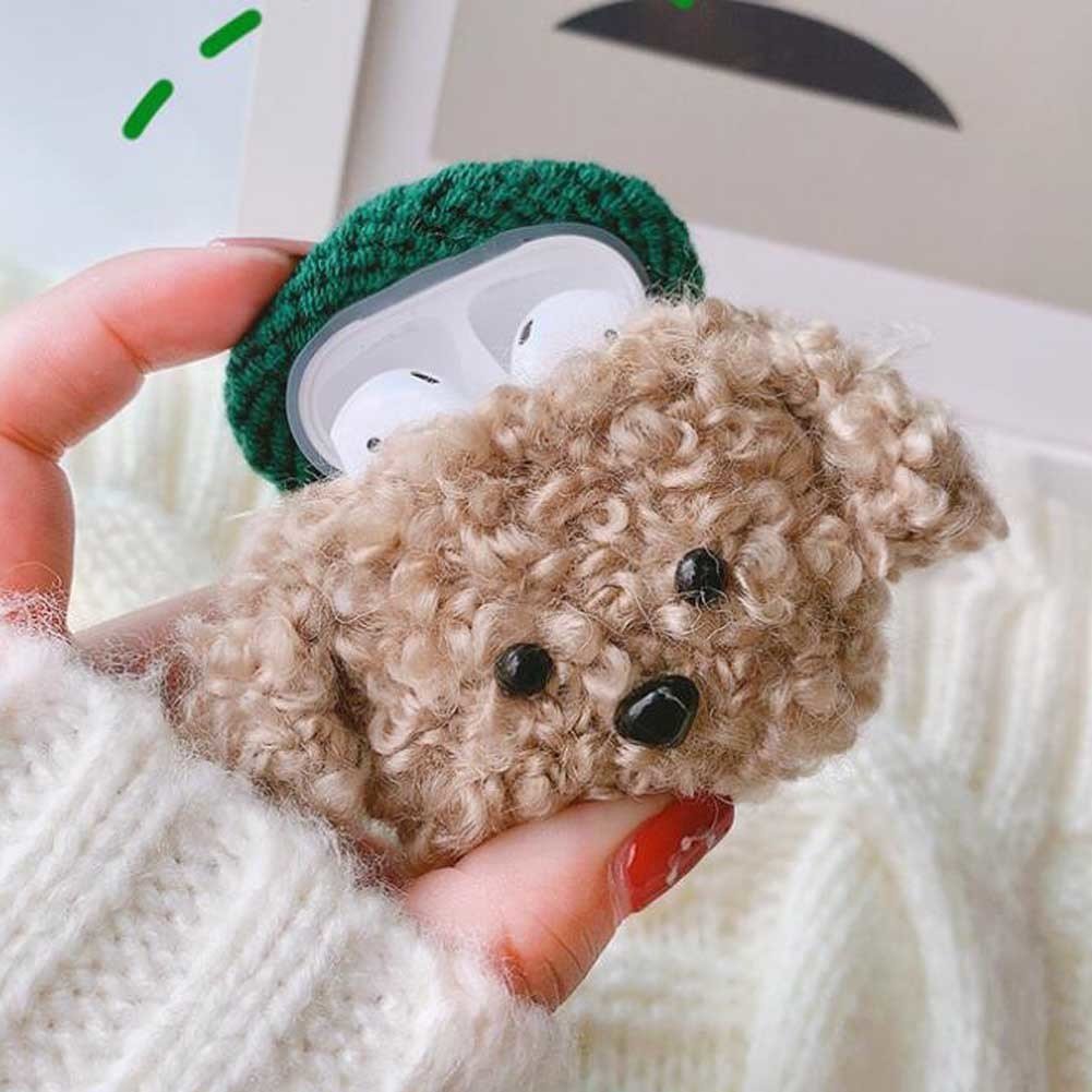 Plush Knitted Wireless Headphone Case Silicone Wireless Bluetooth Earbuds Headphones Case, Brown Dog Green Hat